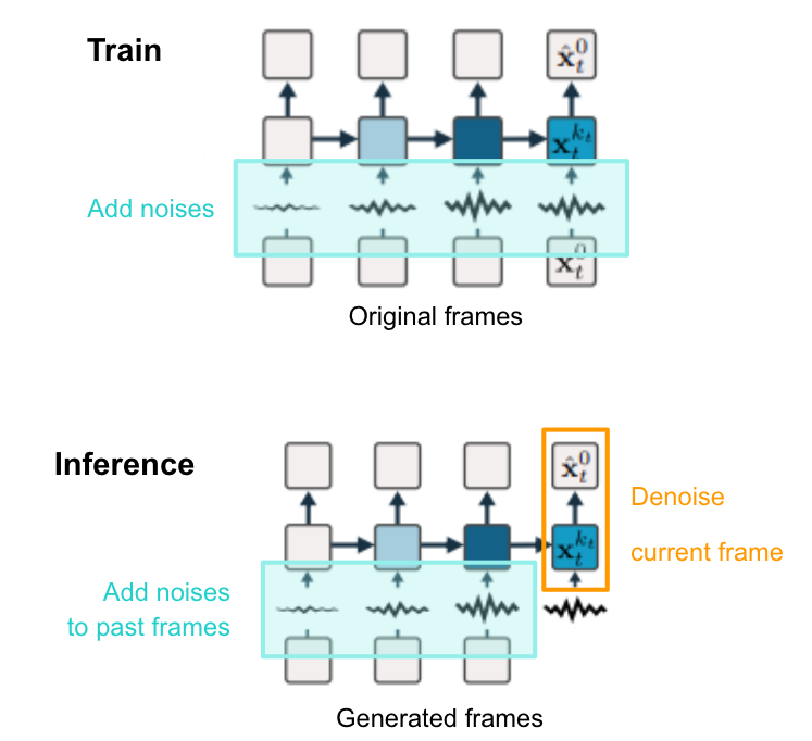 - Train time에 각 타임스텝별로 다른 $\tau$를 넣으므로, 모델은 다양한 수준의 노이즈 레벨을 경험하면서 디노이징하는 방법을 배운다. 따라서 inference time에도 내가 이전에 생성한 프레임에 0.1의 노이즈를 넣어 주면, 훈련할 때 보았던 noisy image 상황을 다시 경험하므로 모델이 더욱 강건하고 안정적인 예측을 보인다. 실제로 내가 만든 프레임이 완전히 clean하거나 약간 noisy하거나의 차이를 줄여 주기도 한다.