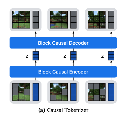 e.g., 과거 프레임 중 $\tau$가 높은 프레임은 원본 프레임과 거의 동일하므로 많이 참고할 만함. - Inference time: 트랜스포머 모델은 전체 시퀀스(e.g., 192 frame)를 입력으로 한 번에 받고, 출력도 한 번에 전체 시퀀스를 낸다. 이때 각 타임스텝마다 spatial token, latent token, action token, agent token 등 여러 토큰이 있는데, 이 모든 토큰을 concat해서 한 개의 토큰 블록으로 만들고, 전체 192개 프레임의 192개 토큰 블록을 모두 합쳐서 입력으로 넣는다. 출력은 Causal masking때문에 나의 이전 프레임만 참조할 수 있으므로 autoregressive하게 순차적으로 생성하는 것처럼 보인다. 이 거대한 input 토큰 블록들끼리 self-attention하면서 각 타임스텝의 프레임을 생성한다. 이때 과거 정보만 볼 수 있도록 하며(Causal attention), 과거의 정보에는 $\tau_{ctx}=0.1$ 의 노이즈를 추가해 robust하게 만든다.