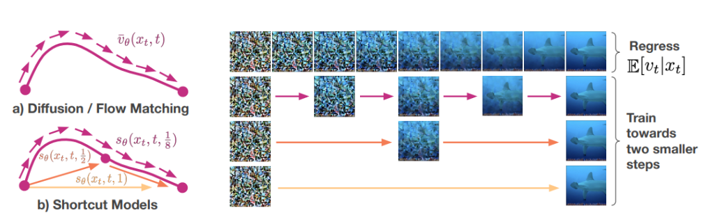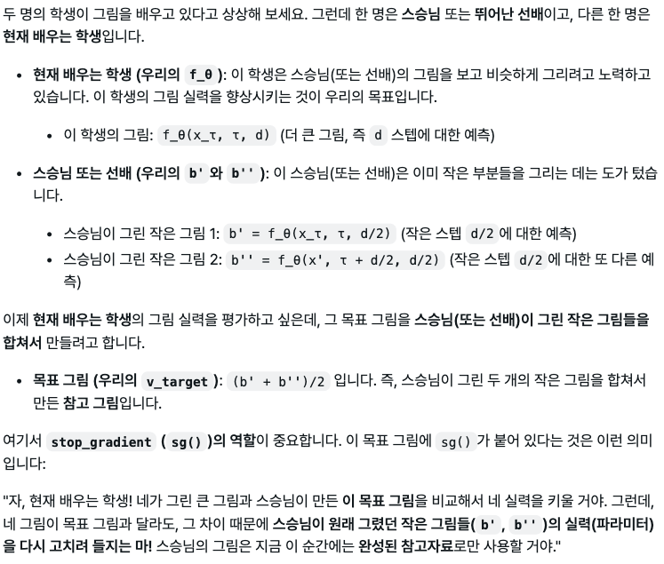 - $b'=f_θ(\tilde{z},τ,d/2,a)$는 $\tilde{z}$에서 시작하여 τ 시그널 레벨에서 스텝 크기 d/2만큼 진행했을 때 도달해야 할 클린한 $\tilde{z}_1$을 예측하는 것이다. $v=(z_1 - z_\tau)/(1-\tau)$ 관계가 성립하므로, b'은 corrupted $z_\tau$에서 clean $z_1$로 d/2만큼의 step으로 가는 방향 벡터이다.