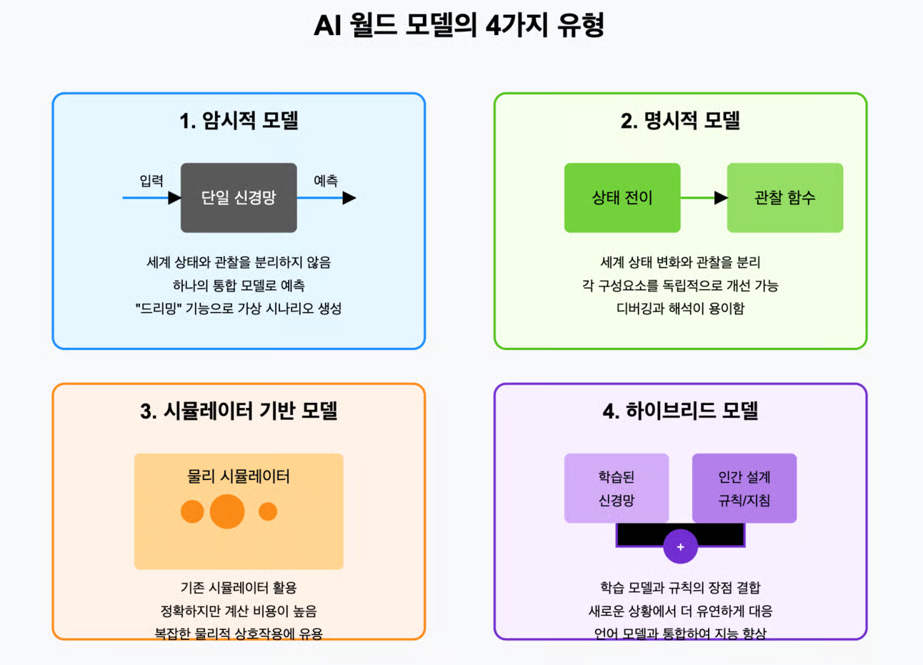 예시) 자동차를 운전할 때, 물리 법칙(가속과 브레이크가 차량 속도에 미치는 영향)과 관찰(백미러와 사이드미러로 보이는 것)을 분리해서 이해하는 것. - Simulator-based Models