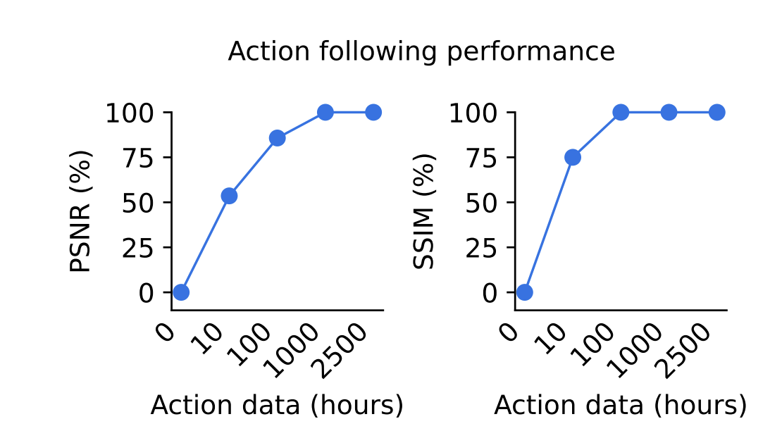 policy로 나온 액션을 주거나, 인간이 직접 액션을 했을 때의 성능을 비교하기도 하고 robot simulation에서 잘 되는지 확인하기도 한다. 신기한 점은 action 라벨링이 된 데이터의 양이 적어도 학습이 잘 된다는 것이다. 이는 모델이 대부분의 학습을 비디오에서 한다는 뜻으로, 환경(게임 dynamics)을 이해하는 것이 모델의 인지 능력을 발전시키는 데 가장 큰 도움이 된다는 것이다!