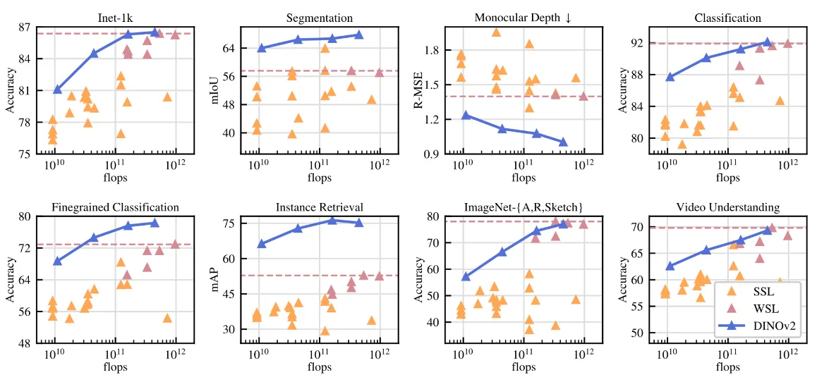 - DINOv2 (파란색 선): 파라미터 크기가 커질수록 성능이 높아지며 대부분 최고 성능
